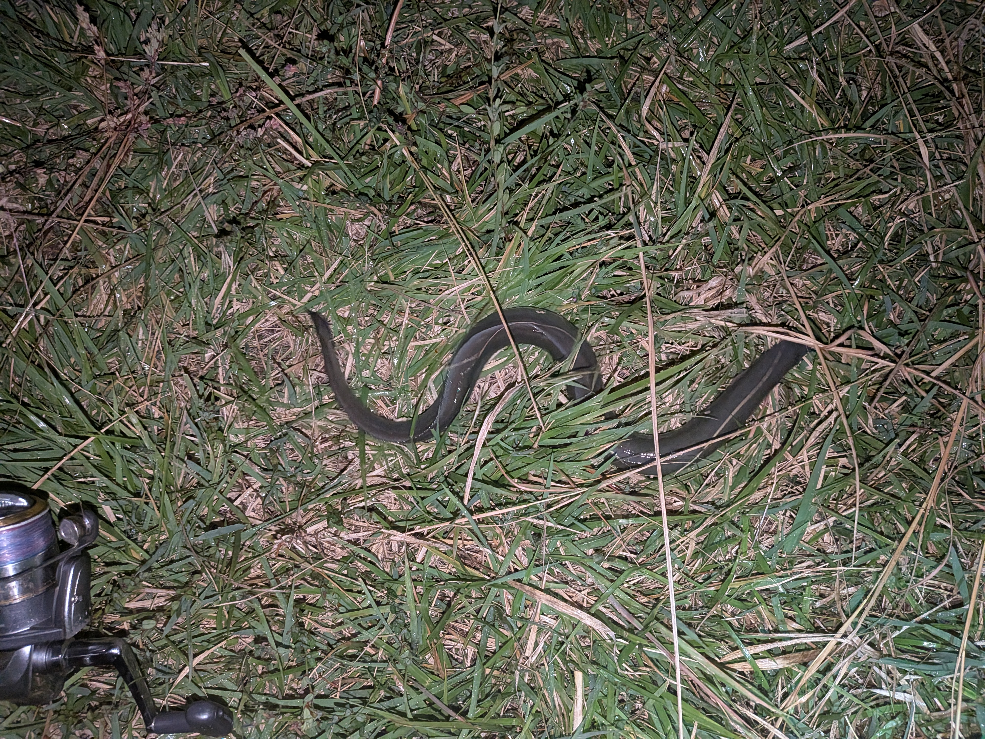 チャンスタイムの夕マズメは不発、時は流れ、20時前にアタリが来ました。巻き上げると、穴に潜ったようで、なかなか出てきません。そうこうしていると、やっと出てきました。釣り上げると待望のウナギ!ボウズ逃れてホッとします。